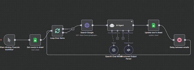 I built an intelligent n8n automation workflow that combines Google Custom Search, OpenAI’s language models, and strategic workflow design to generate hyper-personalized cold emails automatically. This system doesn’t just insert variables—it researches prospects, analyzes their business context, and crafts custom messaging that resonates.