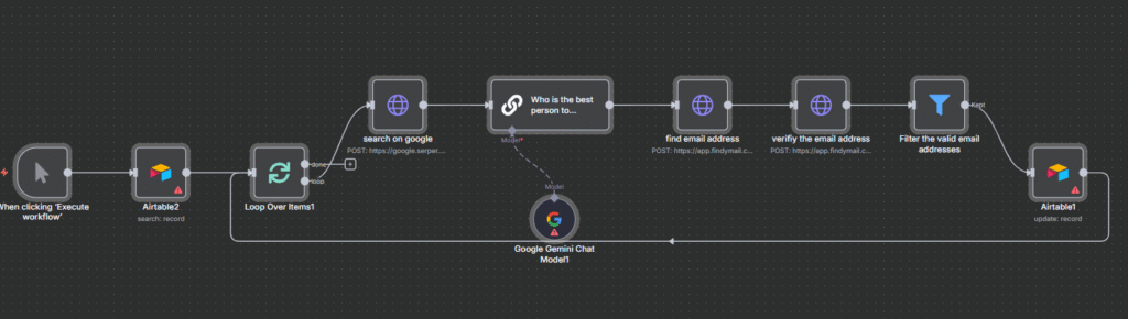Here’s where the workflow gets intelligent. Rather than blindly taking the first search result, it uses Google Gemini’s language model to analyze the top search results and determine the best contact person.
